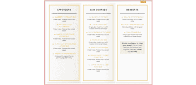 3D Restaurant Menu is a 3D folded menu (a real menu for restaurant/shop/bar…, not a "web" menu). Applying CSS 3D transformation, you can open menu by unfolding and click on the linked items in menu to read additional information. This menu matches any restaurant website’s concept thanks to its elegant traditional layout.