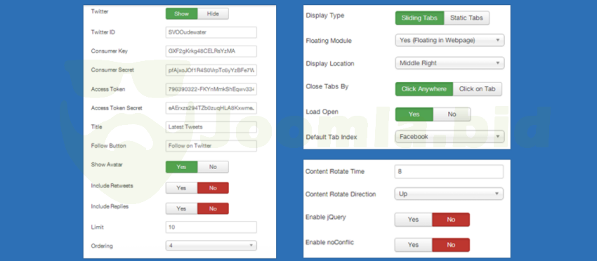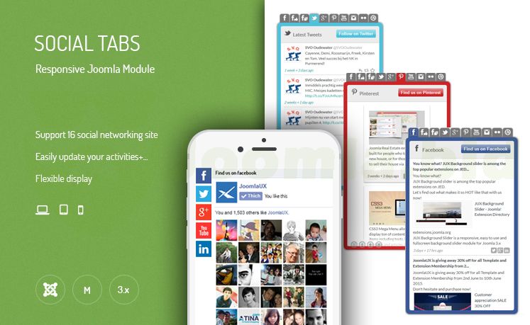 JUX Social Tab is a module developed by the JoomlaUX team which combines 16 social network profiles and unlimited feeds display into slick slide out or static tab with directly real-time updates on your site. Support 12 social network pages. JUX Social Tab includes 12 famous social networks such as Facebook, Twitter, Instagram, YouTube, Pinterest, etc. For each social channel, you can limit the number of posts to display.